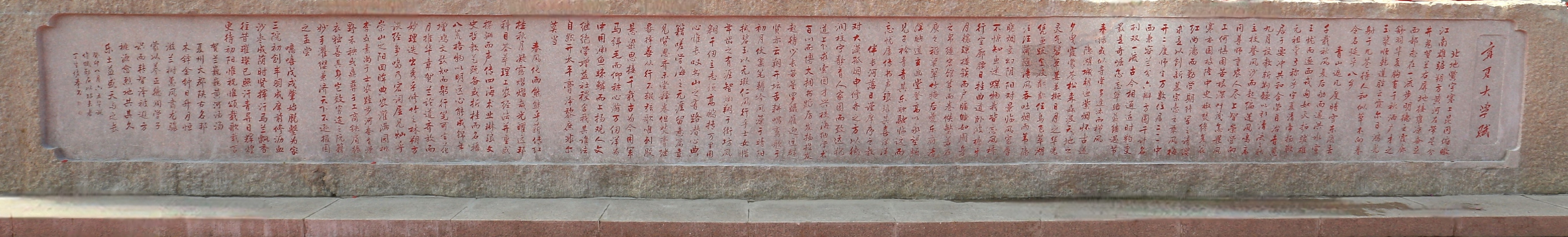 北地黉宇,塞上昆冈。俯瞰江南,雄踞朔方。黄河左带,星分井鬼;贺兰右屏,地接雍凉。奋足西部,志在一流,步明德之霞廊;舒羽华夏,胸有千秋,洒广才之玉浆。顺乾道,胜云霞迩日,鸿光射于九苍;得人和,似草木向春,令名延乎八乡。