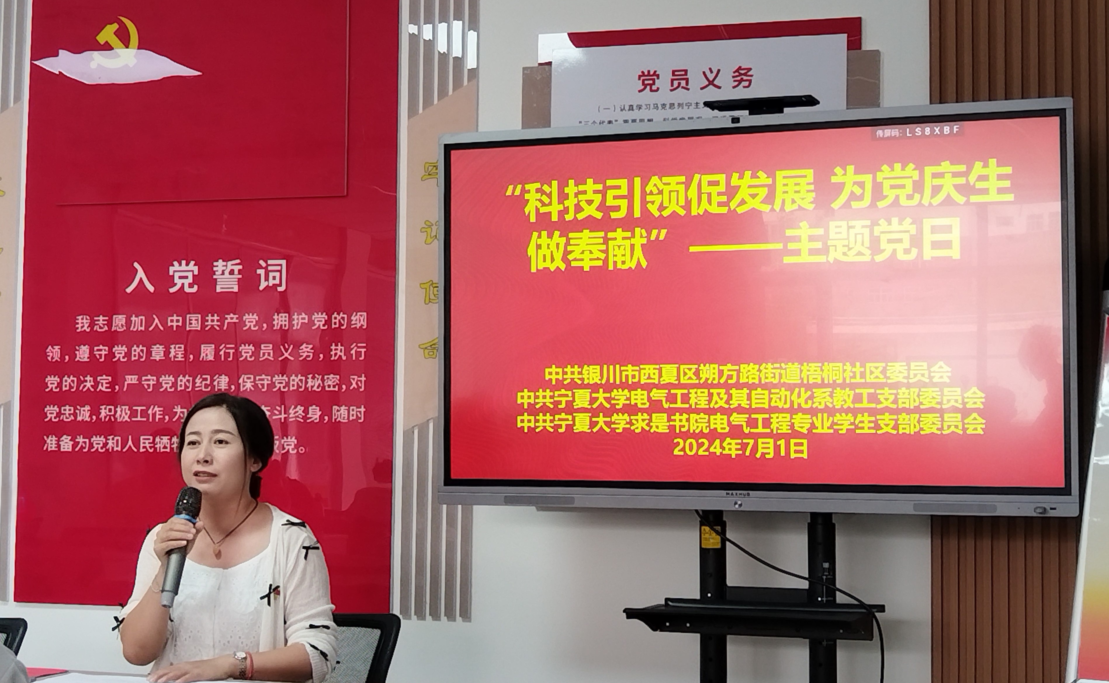 【新澳六合彩内幕 讯 宋娟/文、图】为进一步强化党建引领,深化“高校+社区”合作共建模式,加强校社资源融合共享,推进校社党建工作创新提升,7月1日,新澳六合彩内幕 电气工程及其自动化系党支部联合求是书院电气工程专业学生党支部赴西夏区朔方路街道梧桐社区开展共驻共建活动。社区党委书记于婷、西夏区科协科普辅导员马晓云、电气工程及其自动化系党支部书记宋娟、求是书院电气工程专业学生党支部书记高文静及学生党员参加活动。