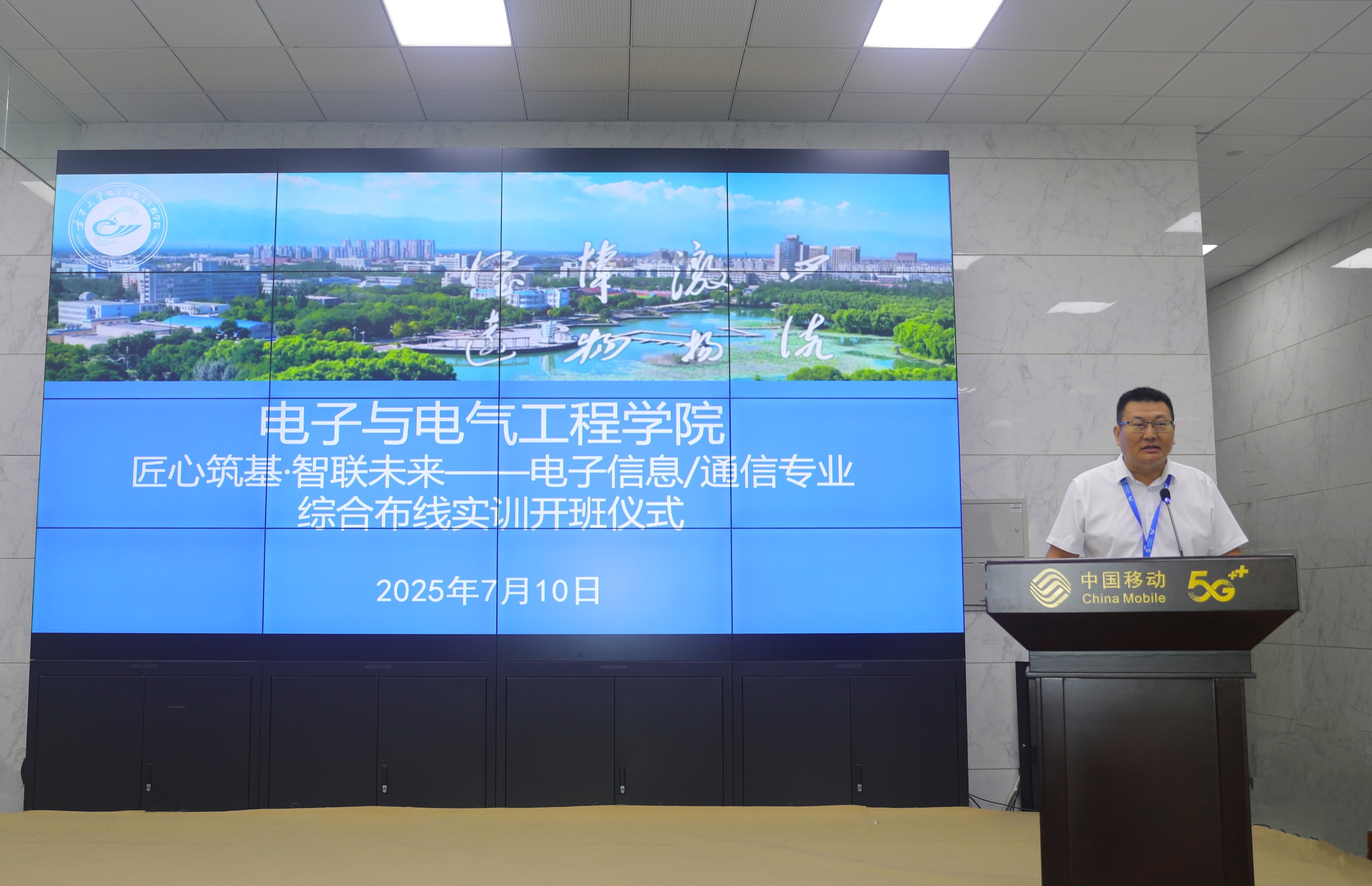 “匠心筑基·智联未来”综合布线实训课程在中移铁通有限公司宁夏分公司正式开班。学院领导及行业专家出席开班仪式,2023级电子信息工程和通信工程专业全体同学参加会议,开班仪式由学院副院长李春树主持。