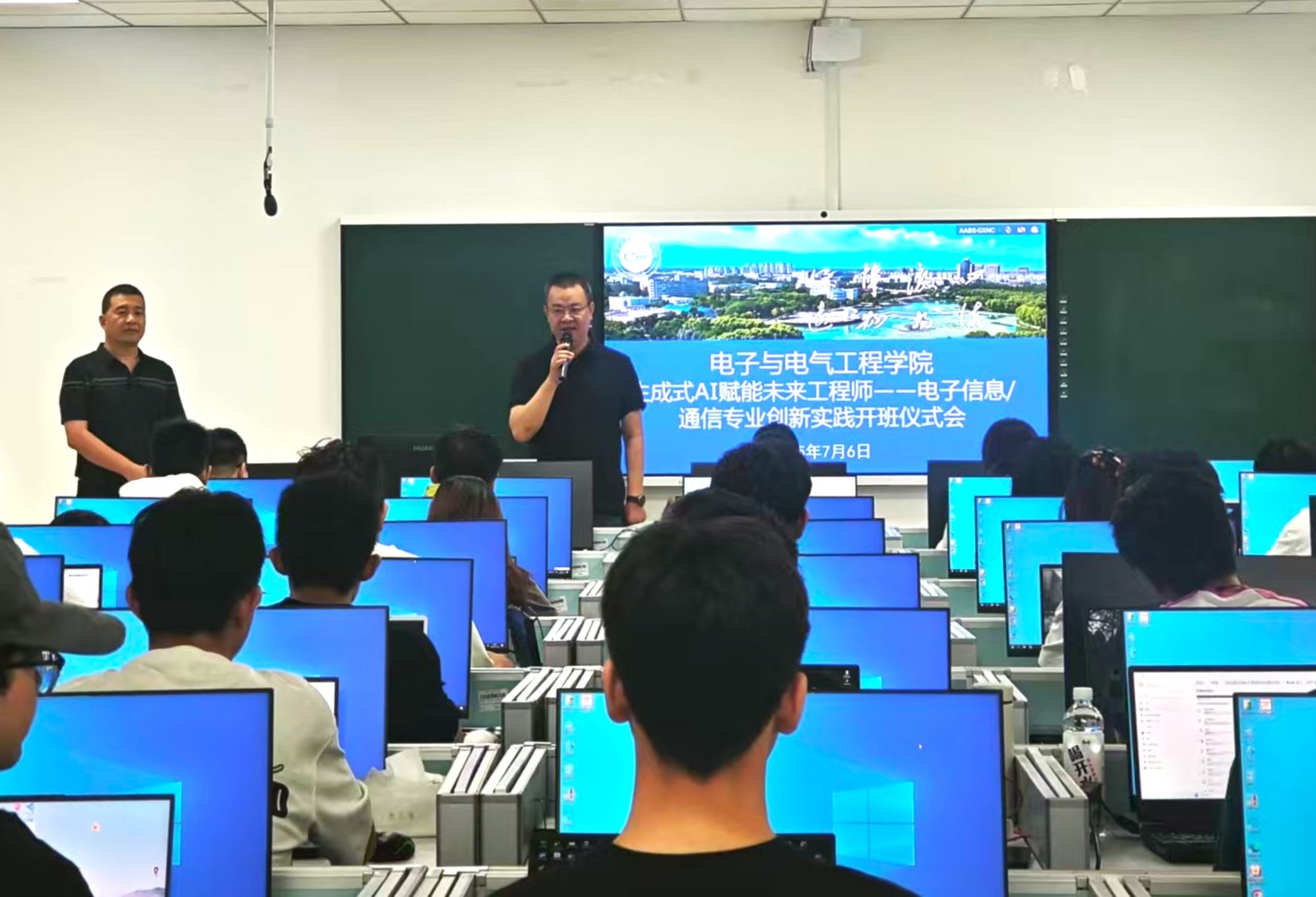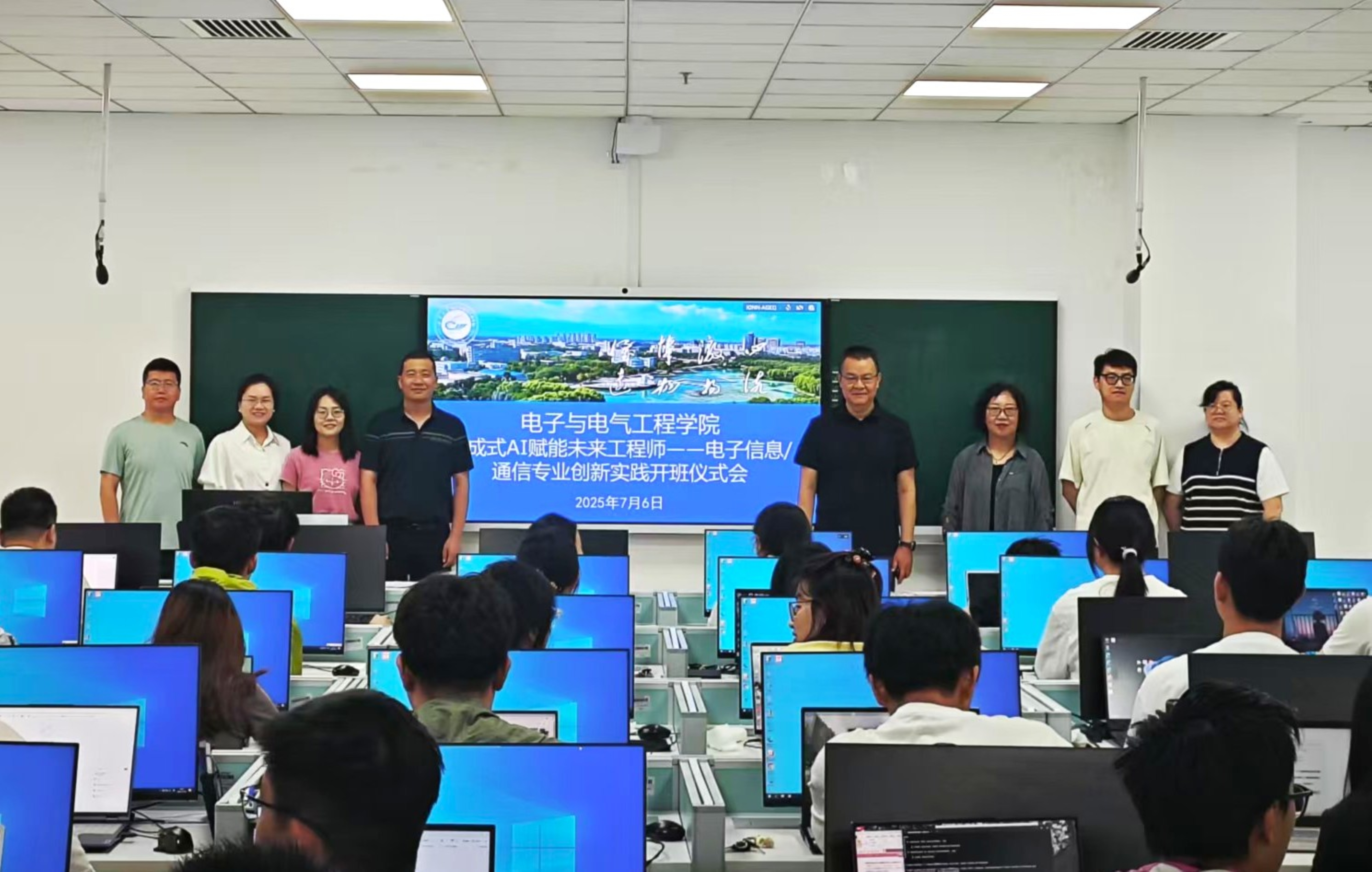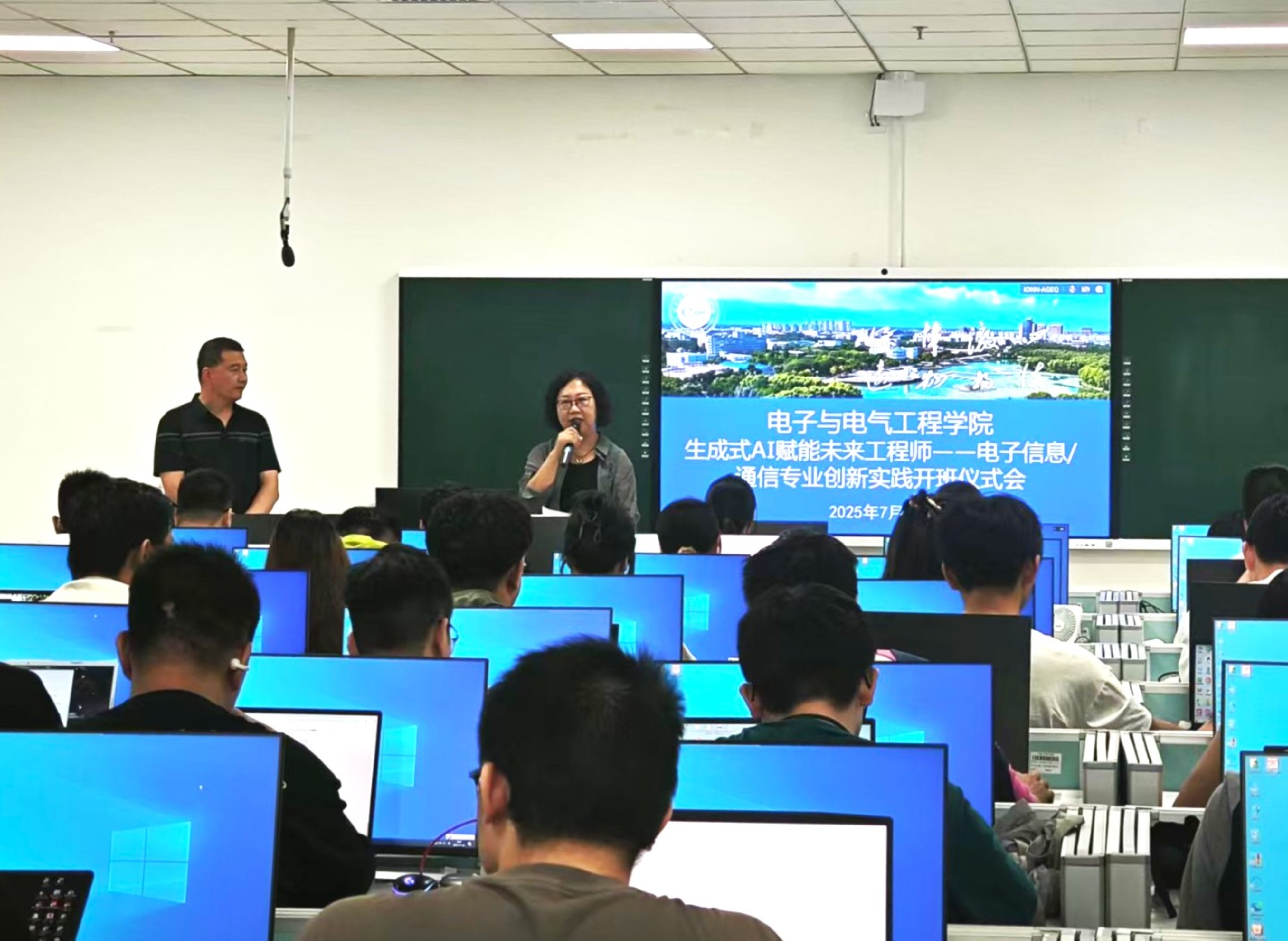 在贺兰山校区笃行楼隆重举行“生成式AI赋能未来工程师——电子信息工程/通信工程专业创新实践”暑期课程开班式。学院领导、行业专家及2022级首批参训同学齐聚一堂,共同见证课程启动。开班仪式由学院副院长李春树主持。