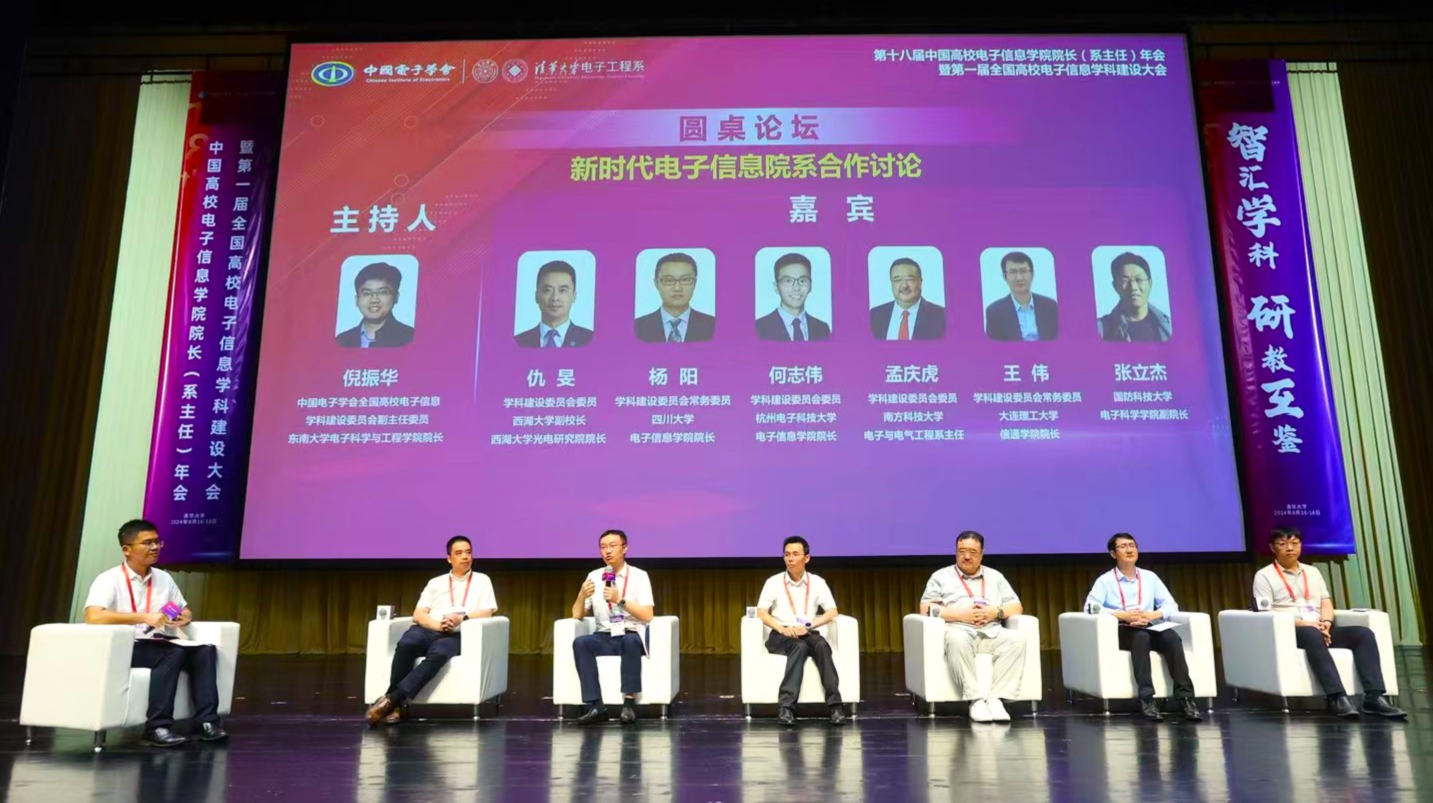 在“新时代电子信息院系合作讨论”圆桌论坛上,西湖大学副校长、西湖大学光电研究院院长仇旻,四川大学电子信息学院院长杨阳,杭州电子科技大学电子信息学院院长何志伟,南方科技大学电子与电气工程系主任孟庆虎,大连理工大学信息与通信工程学院院长王伟,国防科技大学电子科学学院副院长张立杰分别围绕“高校间资源优化和协同创新模式探索”“高校间多渠道学生创新能力培养合作”“融合区域、行业、学科特色的高校间的科研与产学研合作”等内容分享交流。
