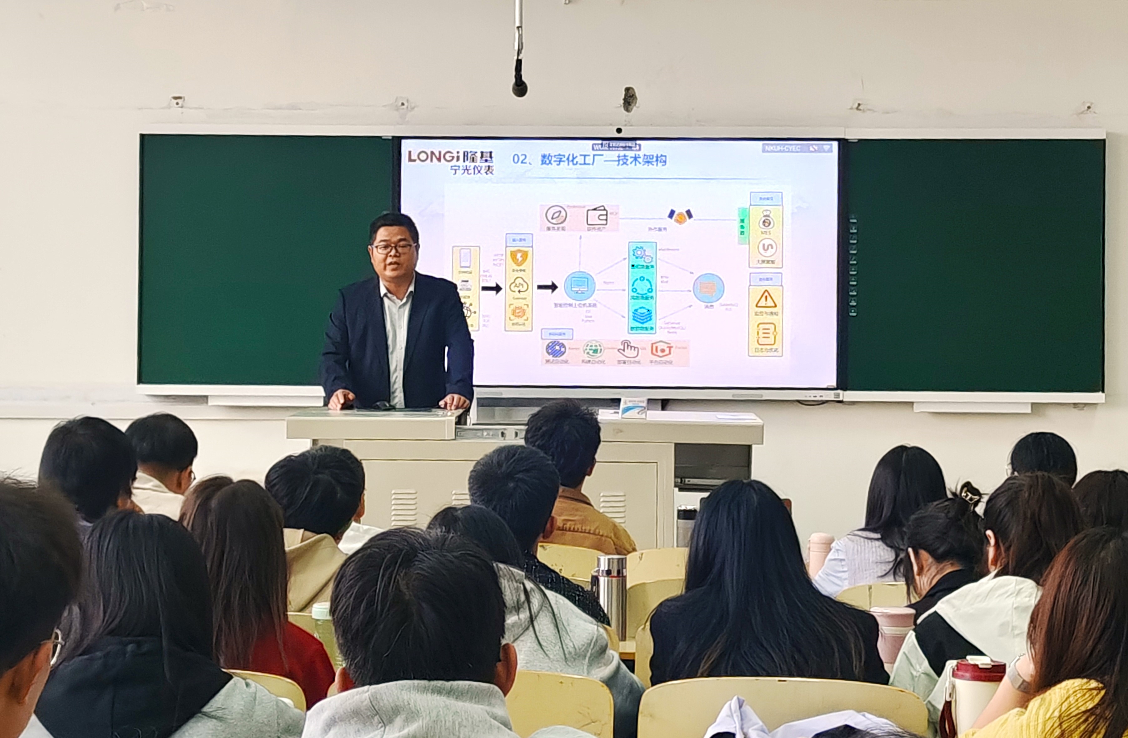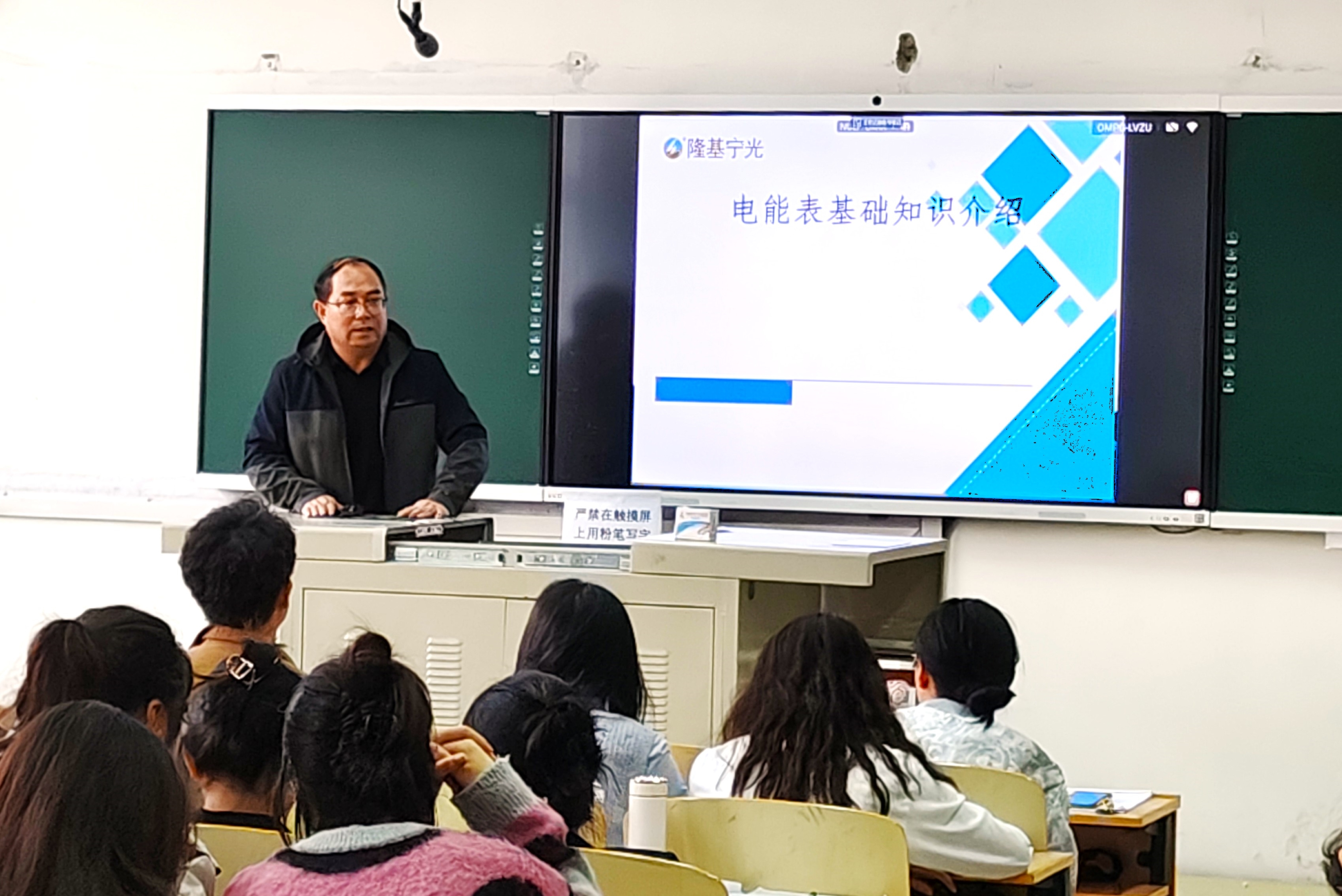 隆基宁光高级工程师武晓勇以电能表为例,对电能表的相关定义、基本组件、功能特点等进行了详细讲解。他讲到,出,随着科技的发展,智能电能表具备了实时数据传输、用户管理等功能,做到了“比电脑还复杂”。电能表制造商和相关企业需要加强技术研发、提升产品质量,以适应未来市场需求的变化。他鼓励同学们去隆基宁光参观,切身体验理论在企业中的应用。