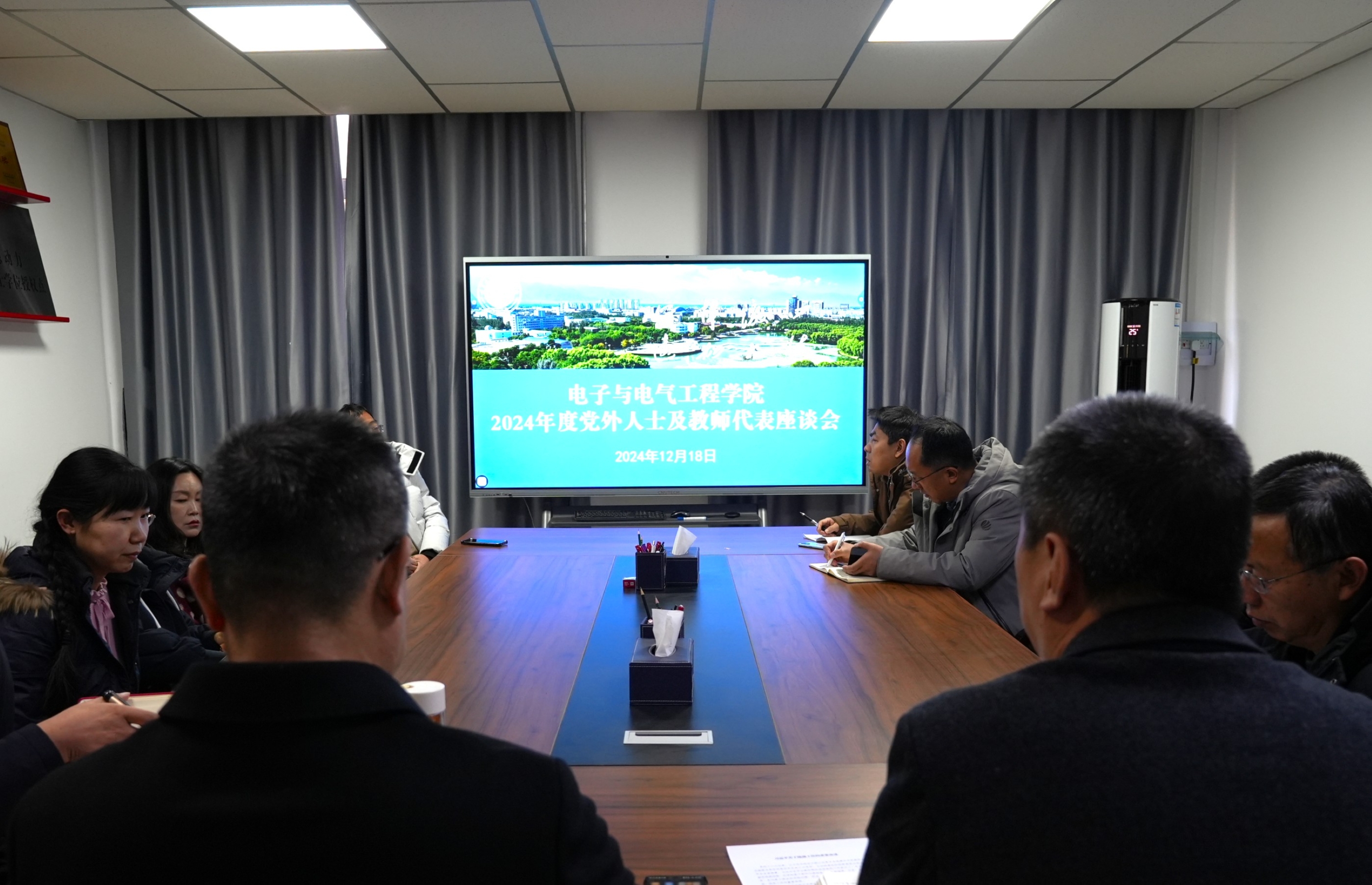 在怀远校区德言楼106会议室召开2024年党外人士及教师代表座谈会,学院领导班子成员、民主党派成员、无党派人士及教师代表等齐聚一堂,共谋学院发展大计。会议由学院党总支书记何彦平主持。