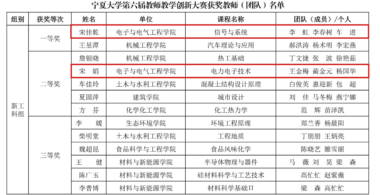 宋佳乾教师团队深耕电子信息类专业课程教学改革,在信号处理与模式识别领域积累了丰富的教学经验。该团队曾荣获第三届全国高校混合式教学设计创新大赛三等奖、宁夏大学第三届教师教学创新大赛课程思政组一等奖等多项荣誉。宋娟教师团队长期致力于电气工程类专业教学创新,在线上线下混合式教学与课程思政融入方面进行了积极探索与实践,曾指导学生在全国高校电气电子工程创新大赛中取得优异成绩。